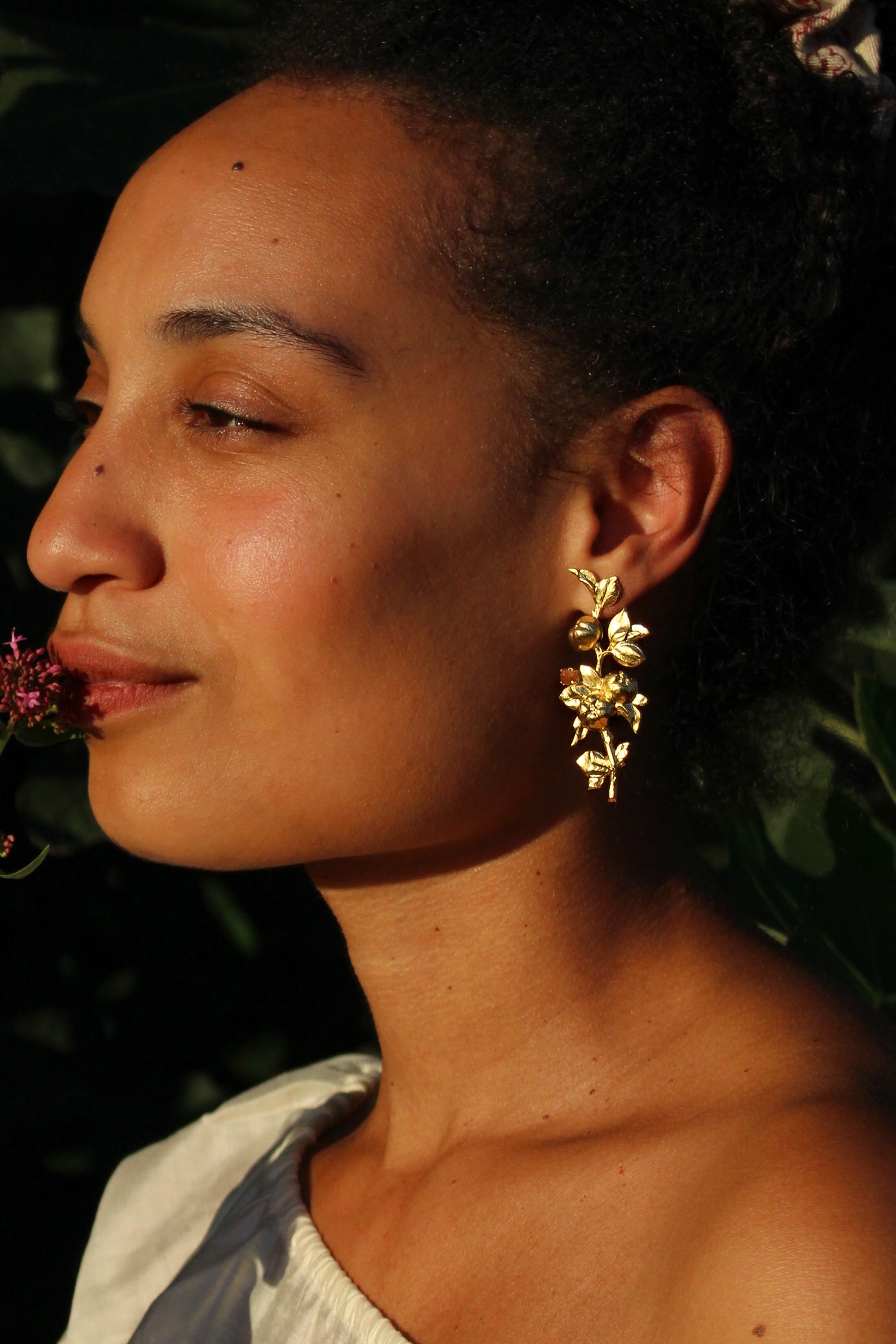 Une nouvelle paire délicate et foisonnante. Les boucles Pomone sont disponibles dans 3 couleurs ornements différents : grenats hessonites (un ambré profond) ou pierres de soleil dorées (un pêche intense et frais) ou perles d'eau douce.